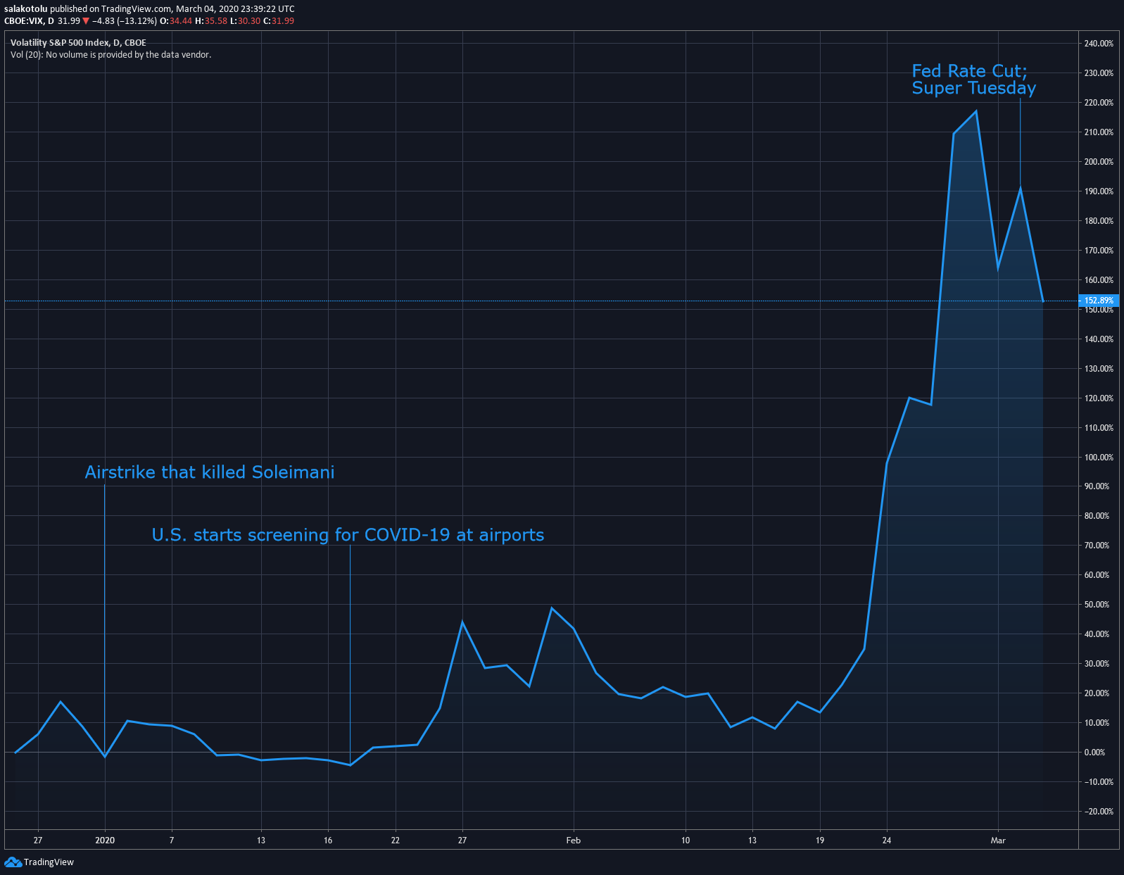 Most investors weren't expecting the U.S. to kill an Iranian general, but the event didn't create any uncertainty. The virus, on the other hand, directly impacts the second largest economy in the world, including cascading effects caused by disruptions in the supply chain of many American companies. And yet - no effect; investors remained certain that everything would be fine. That was until the virus took a first class seat across U.S. borders to pay Americans a visit, then panic ensued. This was no longer just about returns as investors began to worry about their health and safety. Black swan-like events like the virus (it isn't a real black swan) carry a lot of uncertainty that confuses investors and forces them to renegotiate previous agreements. This sudden reaction to uncertainty increases volatility as investors try to make sense of the virus.