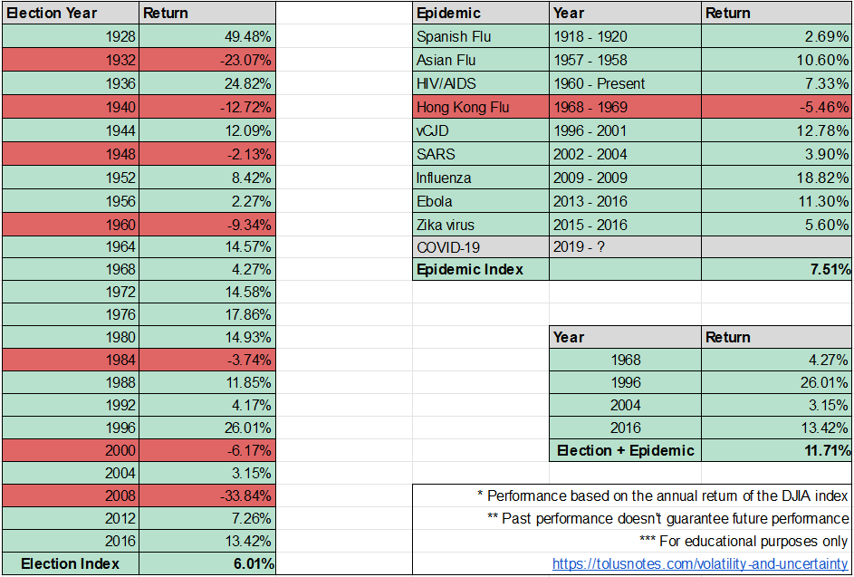 The most uncertain events plaguing the market are the 2020 elections and the Coronavirus. Using historical annual returns of the Dow Jones Industrial Average, I created some hypothetical indices that tracked returns during years with an election or an epidemic crisis. Historically, from 1928 to 2016, investing during U.S. presidential elections returned 6% on average – you made money 70% of the time. That return improves to 11.3% if the S&P 500 index is used, but I'm sticking with the DJIA because it goes all the way back to 1915 vs. the S&P's 1928. The same goes for epidemics. Investing during worldwide epidemics returned 7.5% on average. We also have a few data points on years with both an election and an epidemic. 1968, 1996, 2004, and 2016 all resulted in positive returns. Though this says nothing about the future, it tells us that investors who panicked and sold missed out during those years. It's easy to live in the moment and think that it's different this time – it's not. Even if we have a recession this year, we'll bounce back eventually. All you have to do is to stay invested.